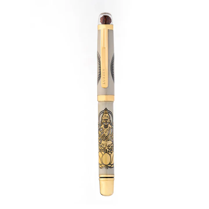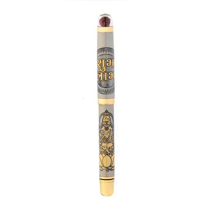 Personalised Sacred Lord Maha Laxmi Ji Metal Roller Pen with Rudraksha Bead – Custom Spiritual Gift