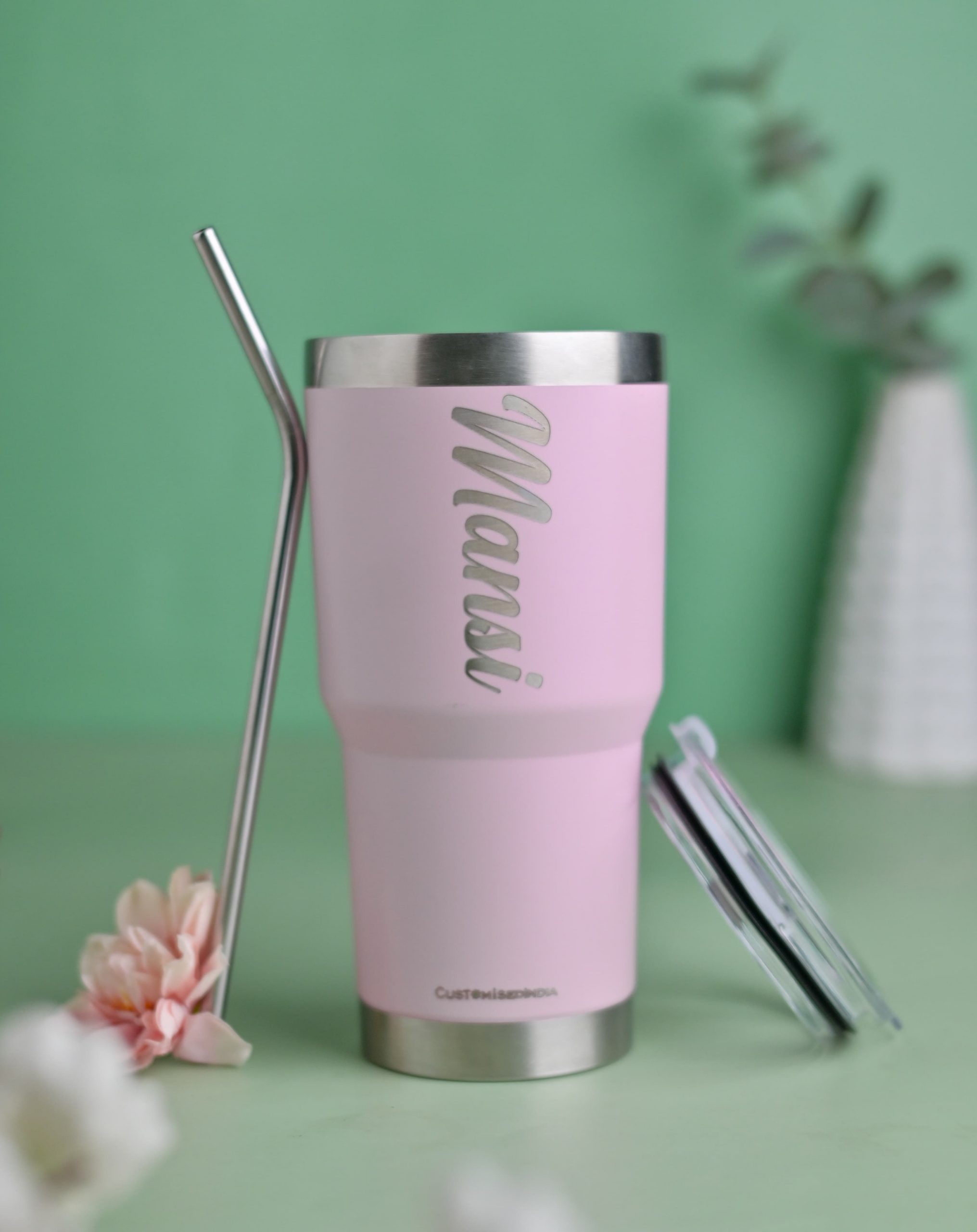 Customised India’s Newest , the sleek and stylish customized coffee tumbler designed for your on-the-go lifestyle! With a 600 ml capacity, this personalized coffee mug is perfect for keeping your beverages hot or cold while you’re out and about. The silicon straw and 2-way lid make sipping easy and mess-free, and its car cup holder-friendly design ensures convenience on your daily commute. Personalize your flask with your name or a special message, making it truly yours. Just like a starbucks tumbler with your name on it.